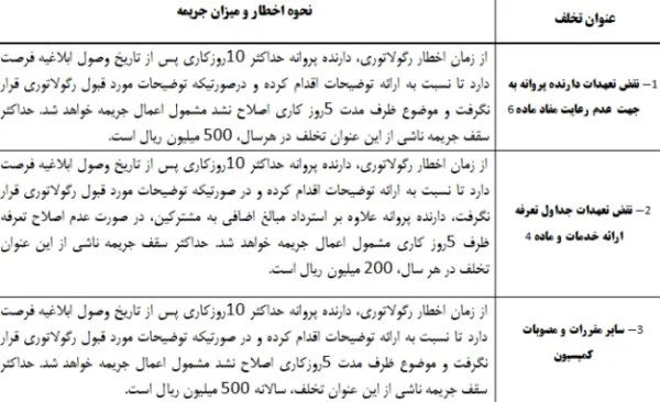 در این راستا میزان جریمه نقض تعهدات دریافت کننده مجوز ارائه این خدمات نیز در جدول زیر اعلام شده است.