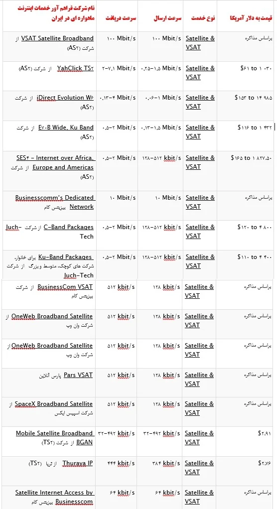 جدول سامانه های اینترنت ماهوارهای که ایران را تحت پوشش خود دارند