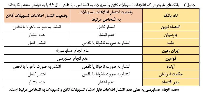 لازم به ذکر است بانکهای خصوصی که نام آنها در جدول فوق نیامده است (بانک های سرمایه، دی، شهر، تجارت، صادرات، گردشگری، رسالت، رفاه، سامان، کارآفرین، سینا، پاسارگاد، خاورمیانه و انصار) علیرغم برخی تاخیرها در انتشار اطلاعات سال 96، در نهایت اقدام به انتشار صحیح دادههای با اهمیت خود کردهاند.