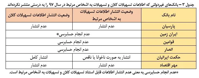 لازم به ذکر است بانکهای خصوصی که نام آنها در جدول فوق نیامده است (بانک های اقتصاد نوین، ملت، سرمایه، دی، شهر، تجارت، صادرات، گردشگری، رسالت، رفاه، سامان، کارآفرین، سینا، پاسارگاد، خاورمیانه و آینده) علیرغم برخی تاخیرها در انتشار اطلاعات سال 97، در نهایت اقدام به انتشار صحیح دادههای با اهمیت خود کردهاند.