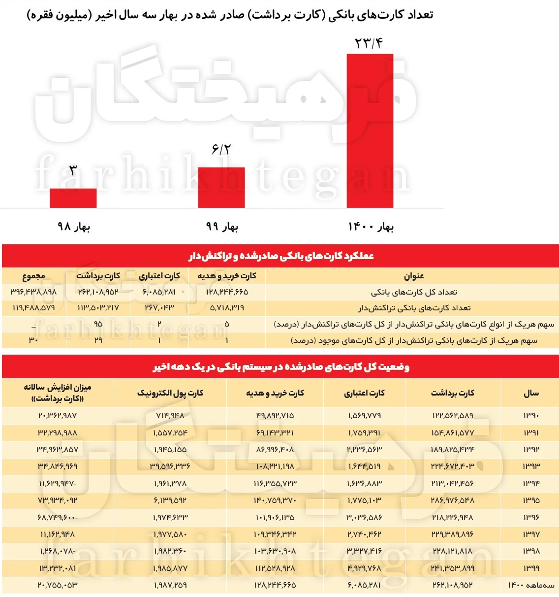 براساس آخرین آمار بانک مرکزی در مجموع بیش از 400 میلیون کارت بانکی(اعم از کارتهای برداشت، کارت هدیه، کارتهای اعتباری و…) وجود دارد که تنها 119 میلیون آن در خردادماه 1400 حداقل یک تراکنش داشته و 300 میلیون کارت بلااستفاده افتاده است. یک حساب سرانگشتی نشان میدهد به ازای هر ایرانی 7 کارت بانکی وجود دارد.