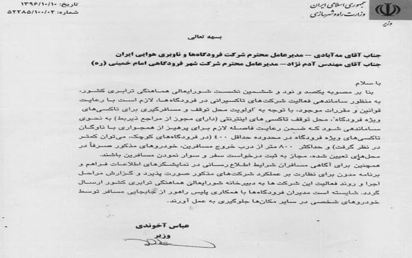 به گزارش خبرنگار مهر، وزیر راه و شهرسازی در دستورالعملی که آن را در تاریخ ۱۰ دی ماه ۹۶ به مدیران عامل شرکت های «فرودگاه ها و ناوبری هوایی ایران» و «شهر فرودگاهی امام خمینی (ره)» ابلاغ کرده بود، نحوه ساماندهی تاکسی های اینترنتی را به عنوان یکی از مصوبات شورای عالی هماهنگی ترابری تشریح کرده است.