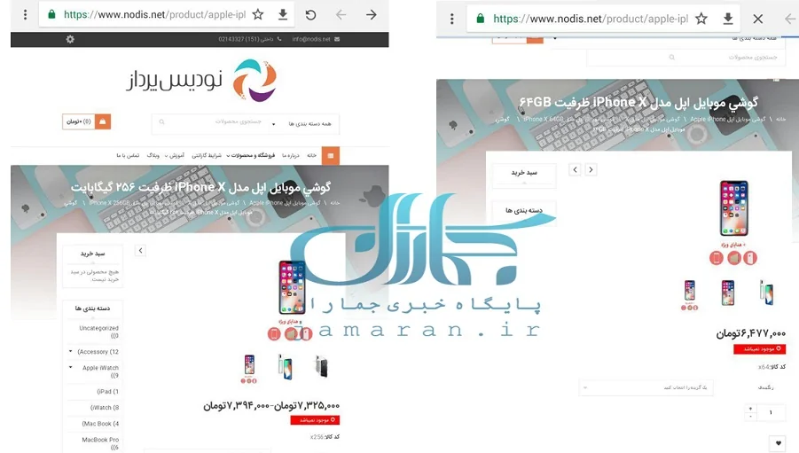 1. شرکت نودیس پرداز وارد کننده شرکت اپل طبق تصاویر زیر که از سایت این شرکت گرفته شده است گوشی های آیفون ایکس 64 گیگ و 256 گیگ خود را با قیمت های 6477.000 و 7.394.000 به فروش می رساند.