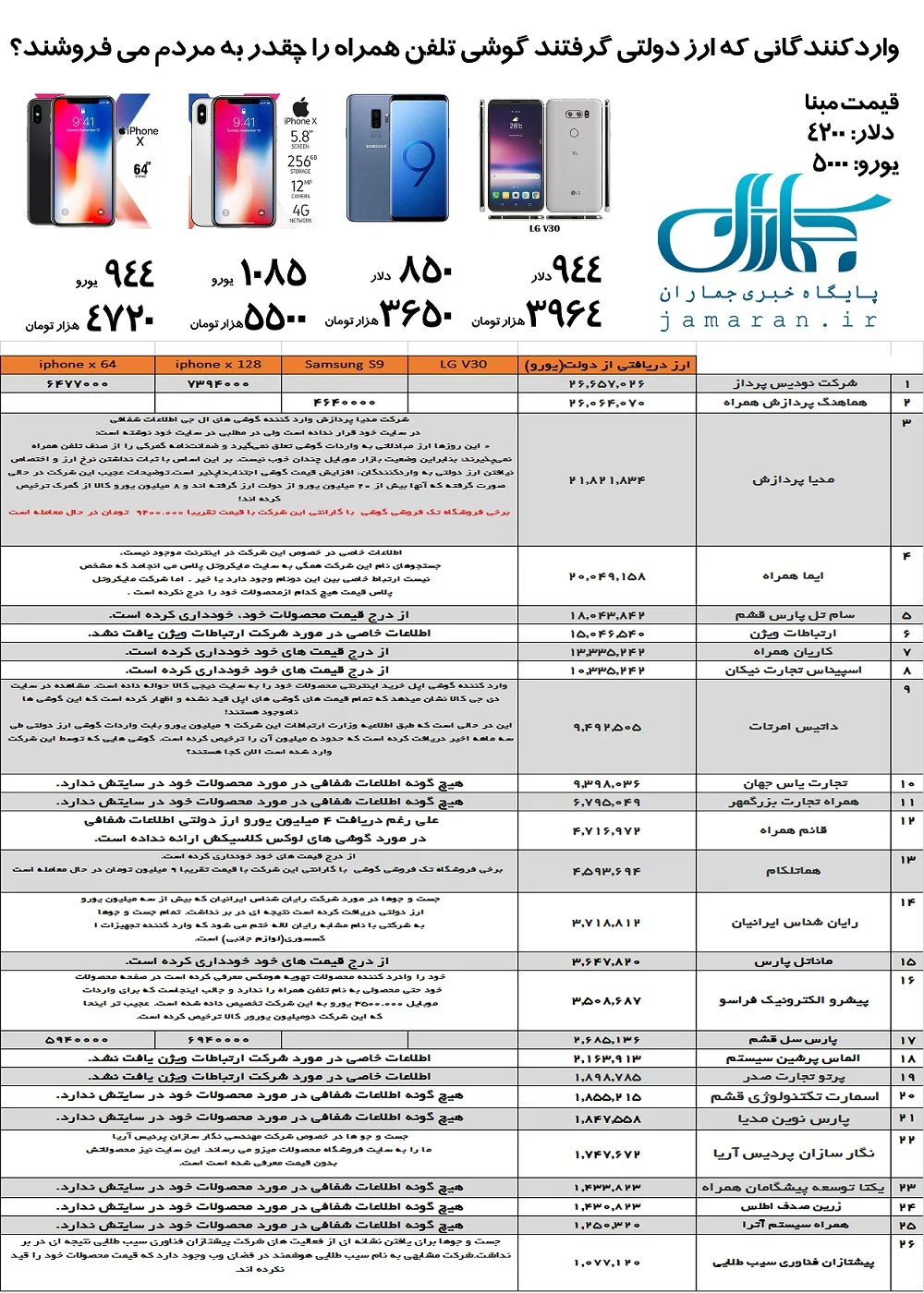 جماران با مبنا قرار دادن گوشی های پر مصرف برندهای معتبری چون اپل، سامسونگ، ال جی و … به بررسی قیمت های فروش شرکت هایی که در لیست اعلامی وزارت ارتباطات هستند کرد.