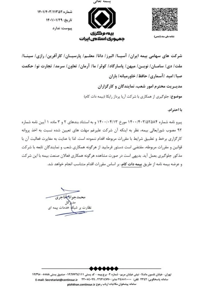 با ابلاغ رسمی بیمه مرکزی تمامی شرکت ها و نمایندگی های صنعت بیمه از هر گونه همکاری با شرکت بیمه آریاپرداز رایکا (بیمه دات کام) منع شدند.