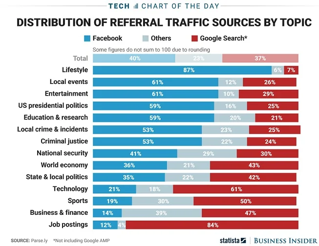 BusinessInsider – براساس این گزارش، گوگل هنوز هم نقش اصلی را در بازی دسترسی به اطلاعات و محتوا ایفا می کند، اما این موضوع تنها مربوط به موضوعات خاص می شود. مقالاتی در مورد فناوری، ورزش و کسب وکار تجارت معمولا بخش اعظمی از ترافیک ارجاعی (Referral Traffic) خود را از جست وجوگر گوگل دریافت کرده اند. این اطلاعات با توجه به تحقیقات شرکت Parse.ly از بیش از 10 میلیون مقاله در سال 2016 به دست آمده است.