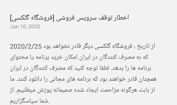 ” از تاریخ ۲۰۲۰/۲/۲۵، فروشگاه گلکسی دیگر قادر نخواهد بود که به مصرف کنندگان در ایران امکان خرید برنامه یا محتوای برنامه‌ها را بدهد. لطفا توجه کنید که مصرف کنندگان در ایران همچنان قادر خواهند بود که برنامه‌های مجانی را دانلود کنند. ما از بابت هرگونه مزاحمت ایجاد شده صمیمانه پوزش می­ طلبیم. از شما سپاسگزاریم. “