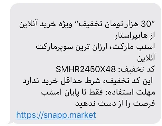 کاربری در حساب توئیتر خود تصویری از پیامک کد تخفیف مدتدار اسنپ مارکت را منتشر کرده و در توضیح آن گفته است: