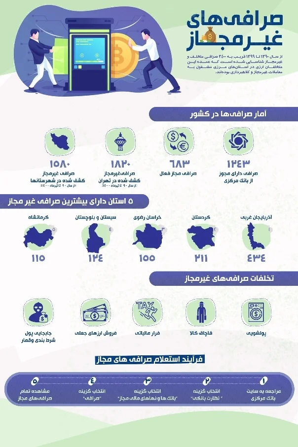 به گفته رئیس کانون صرافان در ۵ استان آذربایجان غربی، کردستان، خراسان رضوی، سیستان و بلوچستان و کرمانشاه به ترتیب ۴۳۴، ۲۱۱، ۱۵۵، ۱۲۴ و ۱۱۵ صراف غیرمجاز توسط وزارت اطلاعات شناسایی شده است.به گزارش تسنیم، طبق برخی شواهد فعالیت صرافان ارزی-حوالجات و صرافان ارز دیجیتال غیرمجاز در فضای مجازی در ماه‌های اخ...