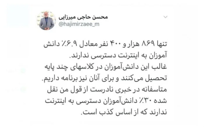 به گزارش فارس، محسن حاجیمیرزایی وزیر آموزش و پرورش در صفحه شخصی خود در توئیتر نوشت: تنها 869 هزار و 400 نفر معادل 6.9% دانشآموزان به اینترنت دسترسی ندارند. غالب این دانشآموزان در کلاسهای چند پایه تحصیل میکنند و برای آنان نیز برنامه داریم. متاسفانه در خبری نادرست از قول من نقل شده 30% دانشآموزان دسترسی به اینترنت ندارند که از اساس کذب است.