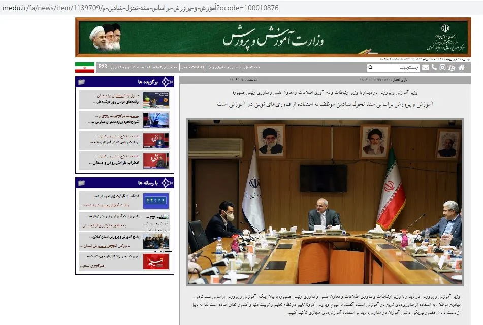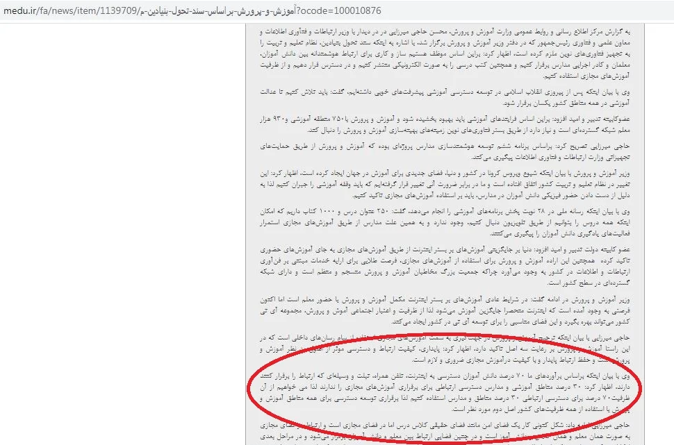 در خبر ذکر شده، آمده است: وزیر آموزش و پرورش با بیان اینکه براساس برآوردهای ما ۷۰ درصد دانشآموزان دسترسی به اینترنت، تلفن همراه، تبلت و وسیلهای که ارتباط را برقرار کنند دارند، اظهار کرد: ۳۰ درصد مناطق آموزشی و مدارس دسترسی ارتباطی برای برقراری آموزشهای مجازی را ندارند لذا می خواهیم از آن ظرفیت ۷۰ درصد برای دسترسی ارتباطی ۳۰ درصد مناطق و مدارس استفاده کنیم لذا برقراری توسعه دسترسی برای همه مناطق آموزش و پرورش با استفاده از همه ظرفیتهای کشور اصل دوم مورد نظر است.