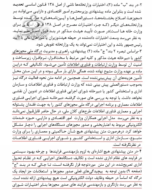با توجه به بررسی‌های صورت‌گرفته، دبیرخانه شورای اجرایی فناوری اطلاعات ذیل ریاست محترم جمهور، معماری و برنامه اجرایی درگاه ملی مجوزهای کشور را به جهت فقدان پشتوانه اجرایی و معماری فناوری اطلاعات طرح‌های کلان ملی، در حال حاضر قابل قبول نمی‌داند و به نظر می‌رسد مدل اجرایی همکاران وزارت امور اقتصادی و داریی، حوزه خدمات الکترونیکی مربوط به اعتباربخشی و صدور مجوزهای دستگاه‌های اجرایی را دچار مشکل خواهد کرد. در هر صورت متن پیشنهادی هیچ شأن حاکمیتی و معماری را برای وزارت متبوع، سازمان اداری و استخدامی کشور و شورای اجرایی فناوری اطلاعات در نظر نگرفته است.