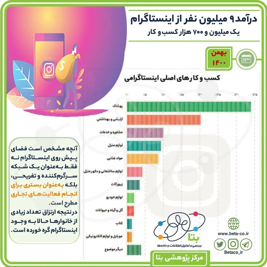 به گزارش مرکز پژوهش‌های بتا بیش از یک میلیون و ۷۰۰ هزار کسب و کار در اینستاگرام فعالیت دارند که حداقل ۲۰۰ هزار کسب‌وکار بزرگ و متوسط و ۵۰۰ هزار کسب‌وکار استانی و بومی را شامل می‌شود و هر کدام از این صفحات، منبع درآمد ماهانه یک یا چند نفر بوده است. در این بین یک میلیون صفحه هم در اینستاگرام وجود دارد که درآمد حداقلی دارند. بتا مدعی است که 9 میلیون نفر از اینستاگرام کسب درآمد دارند
