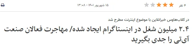 خبرآنلاین در گزارشی بر اساس گفت‌وگوی شکل گرفته در کلاب هاوس اعلام کرده بود، ۲/۴ میلیون شغل در اینستاگرام ایجاد شده است و در بند دوم همین گزارش، با استناد به گفته رضا الفت نسب، عضو انجمن صنفی کارفرمایی فروشگاه‌‎های اینترنتی، آمده است که از نظر اقتصادی، زندگی ۱۱ میلیون  ایرانی به اینستاگرام وابسته است.