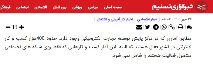 در ادامه گزارش آمده است که در پایگاه سامانه نظام صنفی رایانه‌ای کشور نیز اطلاعاتی درباره کسب و کارهای اینترنتی منتشر شده است و به گفته محسن عامری, دبیر شورای گفت‌وگوی دولت و بخش خصوصی اتاق بازرگانی، دو میلیون و  ۴۰۰هزار کسب‌وکار در اینستاگرام حضور دارند.