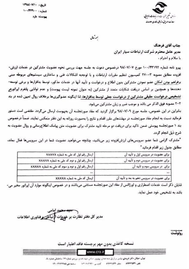 در این نامه سازمان تنظیم مقررات و ارتباطات رادیویی وزارت ارتباطات، شروط جدیدی برای اپراتورهای موبایل در ارائه سرویسهای ارزش افزوده درنظر گرفته است.