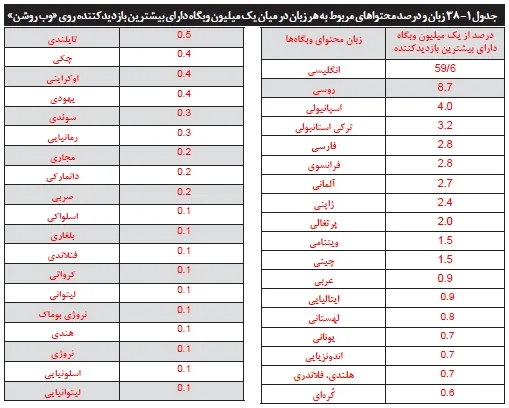 جدول 1- 38 زبان و درصد محتواهای مربوط به هر زبان در میان یک میلیون وبگاه دارای بیشترین بازدیدکننده روی «وب روشن»