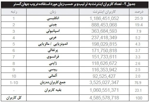 جدول 2- تعداد کاربران اینترنت به ترتیب و بر حسب زبان مورد استفاده در وب جهانگستر