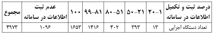 همچنین تعداد 1653 دستگاه اجرایی (معادل 33 درصد از دستگاهها) نسبت به ثبت (100) درصد از اطلاعات اموال خود در سامانه اقدام نمودهاند. با احتساب دستگاههای اجرایی که نسبت به ثبت 81 تا 99 درصدی اطلاعات اموال خود اقدام نمودهاند (معادل 28 درصد)، در مجموع تعداد 3069 دستگاه اجرایی (معادل 62 درصد از دستگاهها) نسبت به تکمیل اطلاعات اموال در سامانه در سطح (80) الی (100) درصد اقدام نمودهاند.