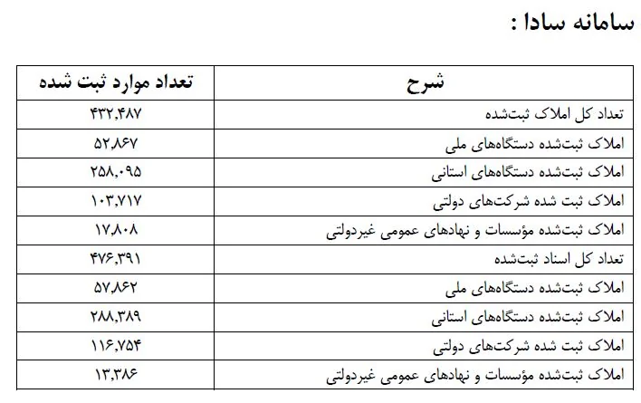 براساس این گزارش، تعداد 1096 دستگاه اجرایی (معادل 22 درصد از دستگاهها) علیرغم تأکید مقنن در مفاد جزء (1) بند (ج) تبصره (12) قانون بودجه سال 1400 کل کشور، نسبت به ثبت اطلاعات ساختمانها، فضاهای اداری و غیراداری، املاک و سایر اموال و داراییهای غیرمنقول خود در سامانه جامع اموال دستگاههای اجرایی (سادا) ظرف مهلت مقرر (تا انتهای اردیبهشتماه1400) اقدام ننمودهاند که عمدتاً مربوط به دانشگاههای علوم پزشکی و وزارت علوم و مراکز علمی پژوهشی و تحقیقاتی وابسته به آنها، شهرداریها، مؤسسات و نهادهای عمومی غیر دولتی و فدراسیونها میباشد.