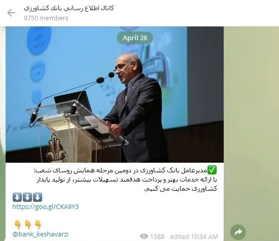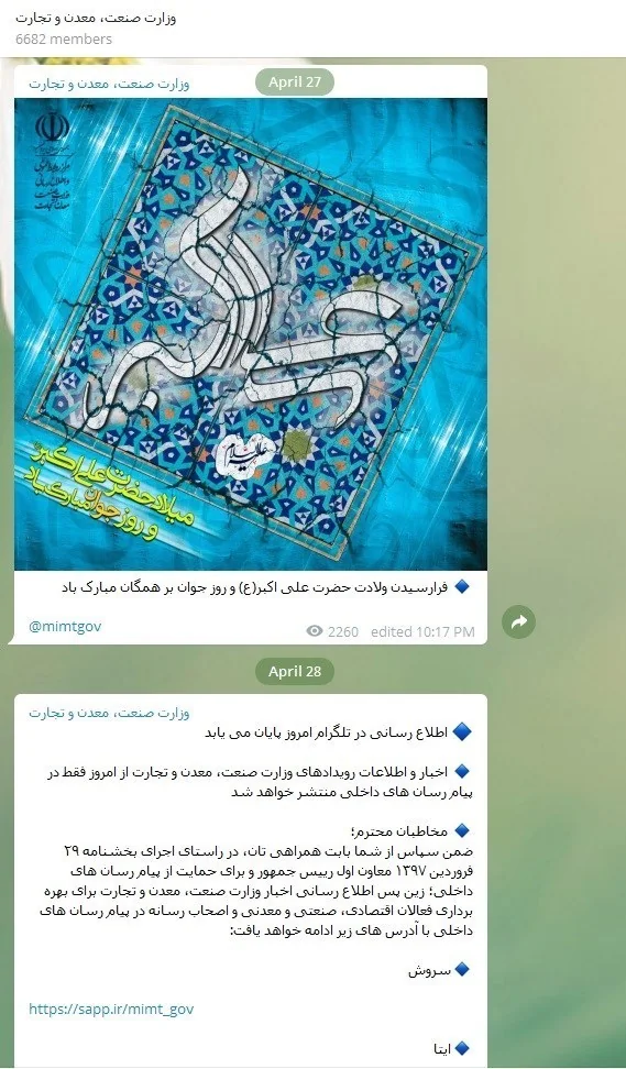 افراسیابی ادامه داد: از آنجا که 29 فرودین ماه تاریخ ابلاغ این بخشنامه بود لذا امروز، هشتم اردیبهشت آخرین مهلت دستگاه های دولتی برای استفاده از تلگرام است و لازم است طبق بخشنامه ابلاغی توسط معاون اول رئیس جمهوری، تمامی دستگاههای دولتی به کار خودشان در تلگرام خاتمه دهند.