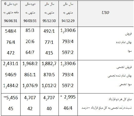 * مطابق صورتهای مالی سال 95، پیش پرداختها مبلغ 235ر1 میلیارد ریال افزایش و اقلام دارایی ثابت به جز زمین که ارتباطی با پروژه USO ندارد تقریباً افزایش نشان نمی دهند و این موضوع بیانگر این است که در سال 95 کالاها و تجهیزات مرتبط با پروژهی USO که منابعی برای آنها مصرف شده طی سال 95 تحویل نشده و کماکان تحت عنوان پیش پرداخت سرمایه ای در صورتهای مالی اشا شده است.