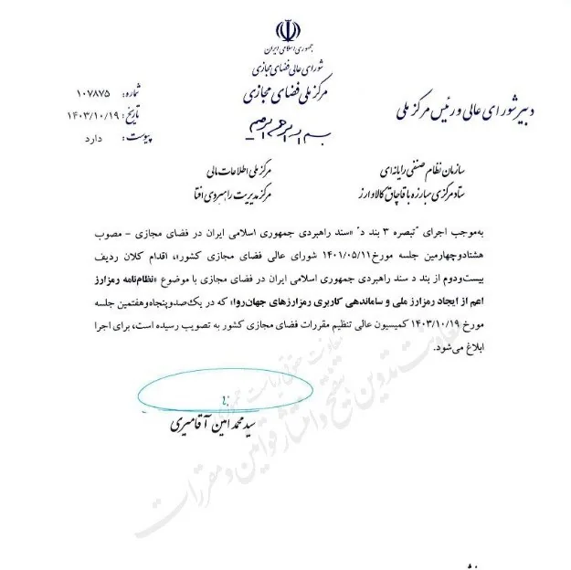 به موجب اجرای تبصره «۳ بند د سند» راهبردی جمهوری اسلامی ایران در فضای مجازی – مصوب هشتاد و چهارمین جلسه مورخ ۱۴۰۱/۰۵/۱۱ شورای عالی فضای مجازی کشور»، اقدام کلان ردیف بیستودوم از بند د سند راهبردی جمهوری اسلامی ایران در فضای مجازی با موضوع «نظامنامه رمزارز اعم از ایجاد رمزارز ملی و ساماندهی کاربری رمزارزهای جهانروا» که در یکصدوپنجاهوهفتمین جلسه مورخ ۱۴۰۳/۱۰/۱۹ کمیسیون عالی تنظیم مقررات فضای مجازی کشور به تصویب رسیده است، برای اجرا ابلاغ میشود.