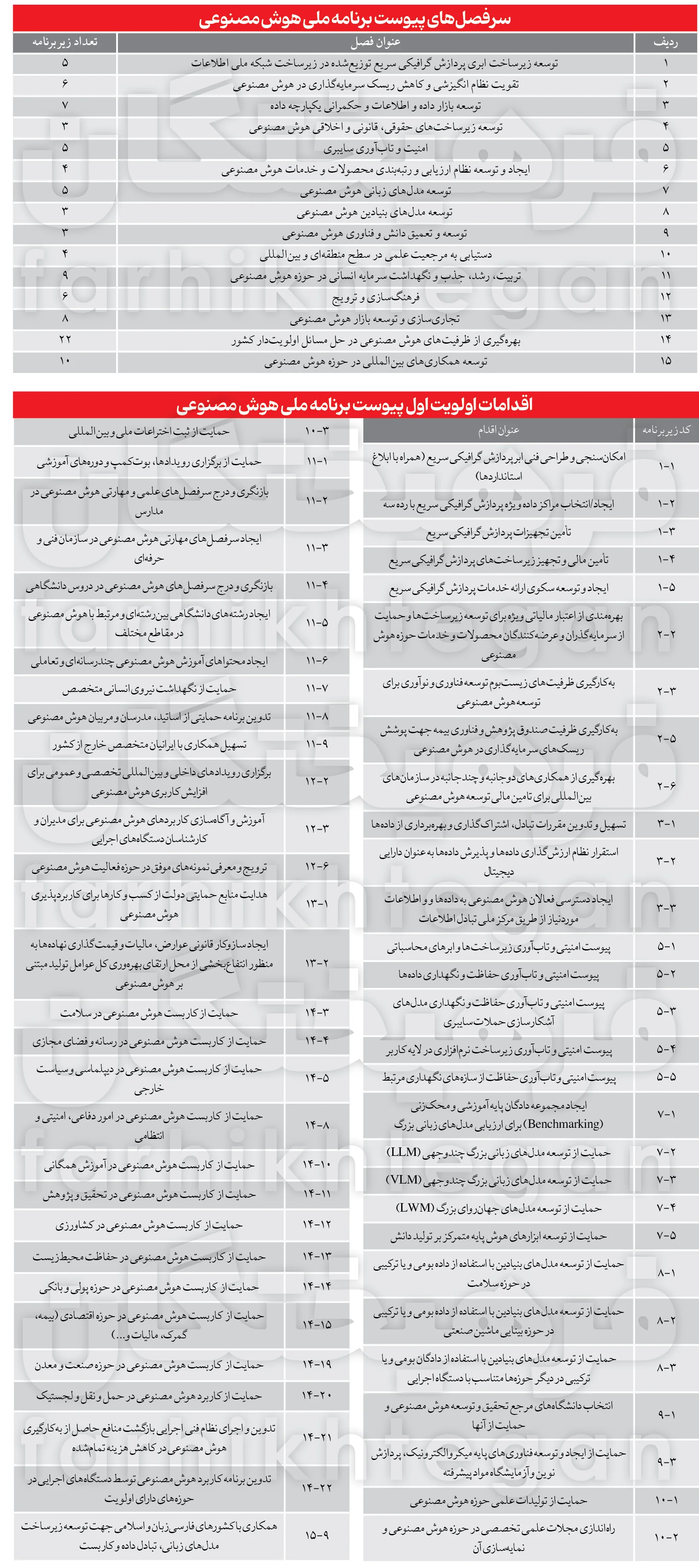 روز گذشته پیوست «برنامه ملی توسعه هوش مصنوعی» برای جمعآوری نظرات و دیدگاههای نخبگان منتشر شد. این معاونت علمی فناوری و اقتصاد دانشبنیان ریاستجمهوری اعلام کرده علاقهمندان میتوانند ضمن مطالعه پیوست این برنامه، تا پنج شهریورماه دیدگاههای خود را به ایمیل pr@isti.ir ارسال کنند. بررسی پیوست منتشرشده نشان میدهد پس از برگزاری دومین نشست مشترک با نمایندگان دستگاهها 13 سرفصل نسخه اولیه حالا به 15 سرفصل افزایش پیدا کرده است. ذیل هر سرفصل زیربرنامه یا با بیانی بهتر اقدام طراحی شده که مجموع آن به 100 مورد میرسد. در جدول پیوست، اولویت، زمان بندی، خروجی یا دستاورد و دستگاههای مجری و همکار هر اقدام هم مشخص شدند.