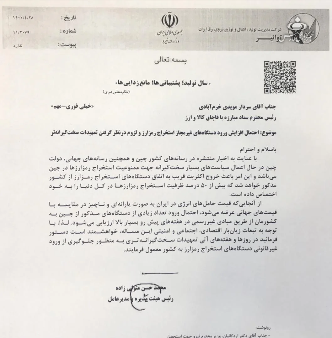 به گزارش فارس، محمد حسن متولی زاده رئیس هیئت مدیره و مدیر عامل شرکت توانیر در مورد احتمال افزایش ورود دستگاه های غیرمجاز استخراج رمزارز و لزوم در نظر گرفتن تمهیدات سخت گیرانه تر به مویدی خرم آبادی رئیس محترم ستاد مبارزه با قاچاق کالا و ارز نامه نوشت.