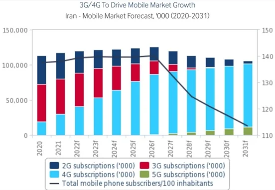 این یادداشت، خلاصه‌ای است از بخش کوچکی از گزارش فیچ سولوشِنر دربارۀ پیش‌بینی رشد مثبت اما کُند بازار خدمات 3G و 4G و نرخ نفوذ اشتراک ارتباطات سیار (سیمکارت موبایل) از سال 2023 م. تا سال  2026 م. ( از هم اکنون تا 1405 خورشیدی) و سپس رشد منفی بازارهای مذکور در کشور، تا سال 2031 م. [رجوع شود به نمودار پیوست]