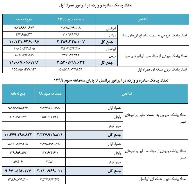 بر اساس آمار رگولاتوری، مشترکان ایرانسل در 3 ماهه پاییز سال 99 بیش از 4 میلیارد پیامک برای یکدیگر ارسال کرده‌اند.