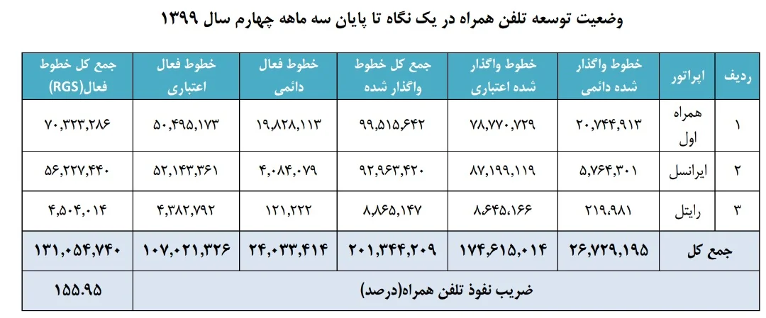 گزارش منتشره از سوی سازمان تنظیم مقررات و ارتباطات رادیویی کشور در مقطع زمانی منتهی به 3 ماهه پایانی سال 99 نشان میدهد که همراهاول رکورد بیشترین سیمکارت واگذار شده و بالاترین مشترک فعال در کشور را دارد.