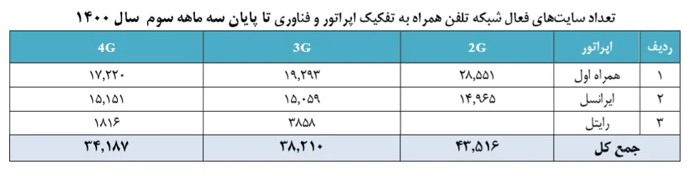 و در نهایت اینکه در خصوص آخرین نسل آنتنهای 4G که از قضا بیشترین رقابت و تبلیغات اپراتورها نیز حول آن میچرخد، آمارها نشان میدهد که بالغ بر 34هزار آنتن نسل چهار در کشور دایر شده است که از این تعداد نیز به ترتیب، همراهاول با حفظ پیشتازی خود، بیش از 17هزار آنتن فعال، ایرانسل بیش از 15هزار آنتن و رایتل نیز تنها 1800 آنتن در اختیار دارند.