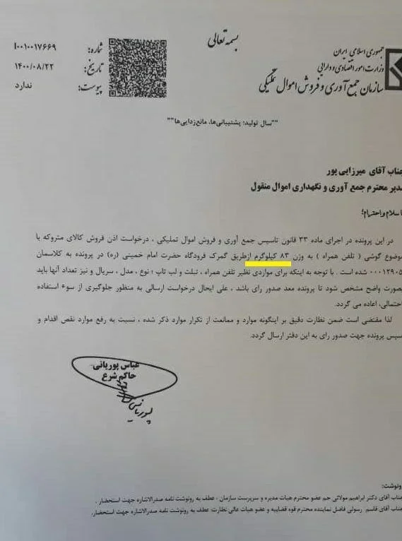 در متن پاسخ به این مدیر کل سازمان به حاکم شرع سازمان اموال تملیکی آمده است، گمرک فرودگاه اطلاعات اولیه کالا را بر اساس وزن و یا نگله در اظهارنامهها جهت محاسبه انبارداری و باربری ثبت میکند و این یک تعرفه بین المللی در تمام کشورها است و بر همین اساس اطلاعات کالایی به سازمان منعکس شده است. پس از ثبت اطلاعات اولیه کالا در سازمان، مدیر استان نیز بر اساس اطلاعات اولیه دریافتی از گمرک اقدام به مکاتبه جهت اخذ اذن شرعی مینماید (نامه شماره 12905 000 مورخ 8/5 1400).