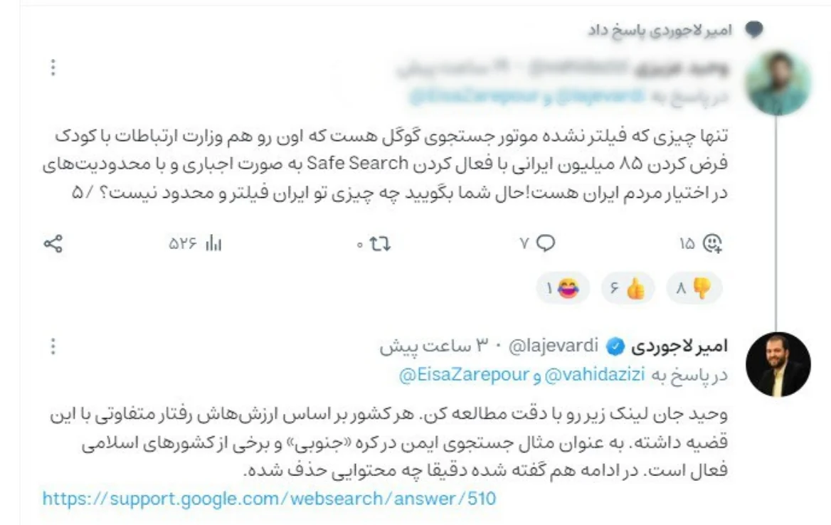لاجوردی در پاسخ، با ارجاع به صفحه … نوشت: «وحید جان لینک زیر رو با دقت مطالعه کنید. هر کشور بر اساس ارزشهای خود رفتار متفاوتی با این قضیه داشته. به عنوان مثال جستجوی ایمن در کره جنوبی و برخی از کشورهای اسلامی فعال است. در ادامه هم گفته شده دقیقا چه محتوایی حذف شده است.»
