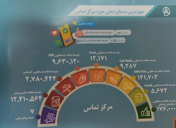 – تلفن گویا (IVR): بر اساس آمار، متوسط پاسخگویی از طریق تلفن گویا، بیش از 9 میلیون و 630 هزار تماس بوده است.
