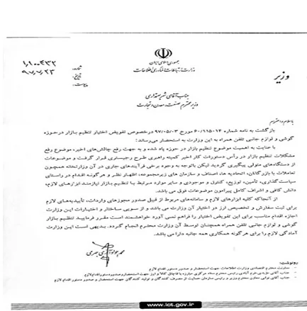 در متن نامه محمد شریعتمداری، وزیر مستعفی صنعت به محمد جواد آذری جهرمی، وزیر ارتباطات و فناوری اطلاعات آمده است: «با عنایت به غلبه موضوعات فنی و تخصصی گوشی‌ و لوازم جانبی تلفن همراه  و اشراف آن وزارتخانه جزئیات امور مربوط به نیازهای عمومی، عرضه و تقاضای آن و همچنین تمرکز امور وارداتی و مبارزه با قاچاق در اجرای طرح رجیستری وکنترل واردات به منظور هماهنگی در اقدامات آتی و جلوگیری از تصمیمات موازی شایسته است تا تنطیم بازار گوشی‌تلفن همراه اعم از سیاستگذاری تامین، توزیع، کنترل موجودی و غیره در قالب کارگروهی به ریاست جنابعالی و نمایندگان سایر سازما‌های ذیربط و از جمله این وزارتخانه صورت پذیرد.»