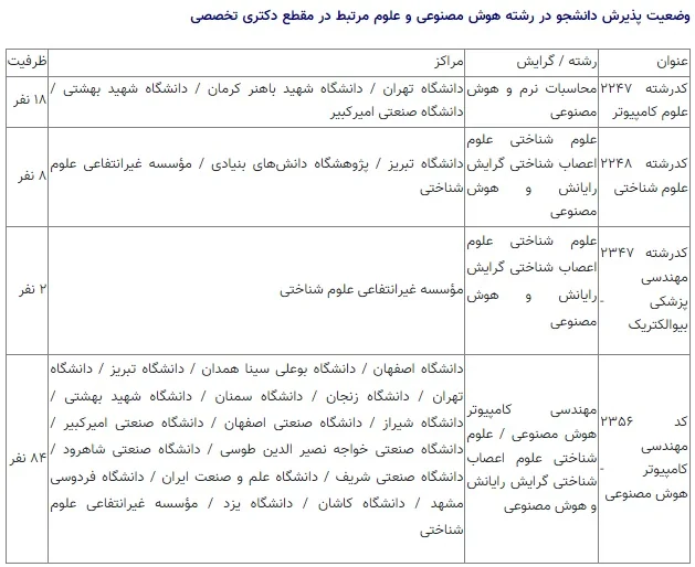 در آزمون دکتری تخصصی سال ۱۴۰۰ دانشگاههای وابسته به وزارت علوم در رشته هوش مصنوعی و علوم مرتبط تعداد ۱۱۲ نفر ظرفیت برای ۱۷ دانشگاه، یک پژوهشگاه و یک مؤسسه غیرانتفاعی در این گرایش خاص تعیین شده است.