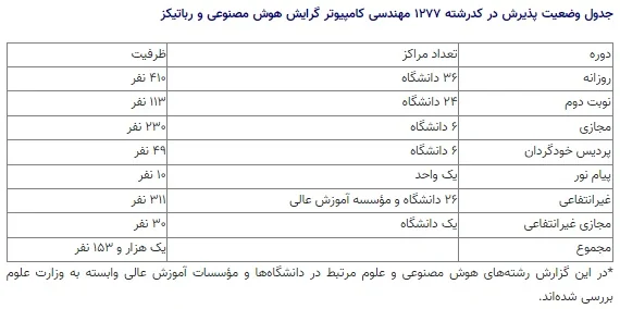 وضعیت در آزمون کارشناسی ارشد سال ۱۴۰۰ متفاوتتر است و تعداد یک هزار و ۵۵۵ نفر ظرفیت در مجموع برای تمام رشتههای هوش مصنوعی و علوم مرتبط با آن در دانشگاهها تعیین شده است.