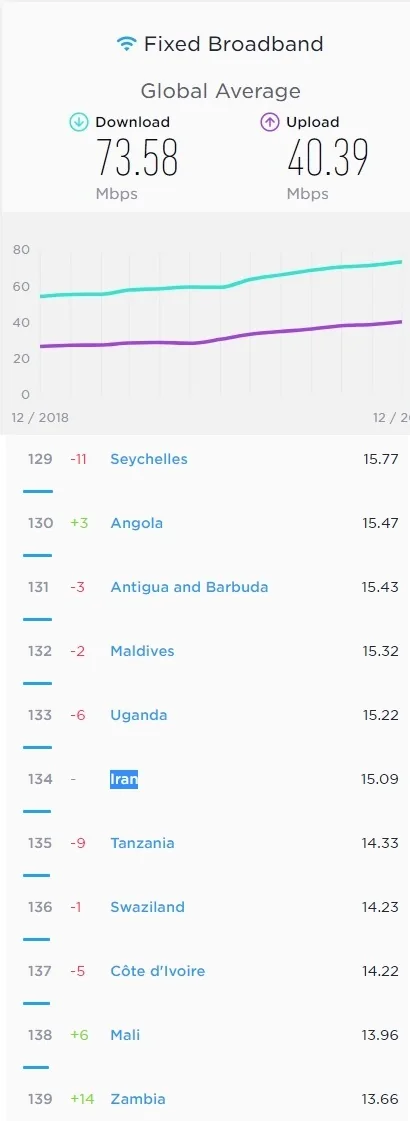 در اینترنت پرسرعت ثابت نیز اگرچه ایران افت رتبه نداشته، اما وضعیت مناسبی ندارد. در زمینه اینترنت پرسرعت ثابت، متوسط سرعت دانلود جهانی 73.58 مگابیت در ثانیه است. اما ایران که نتوانسته از فناوریهای روز در این زمینه بهره بگیرد، با متوسط سرعت دانلود نازل 15.09 مگابیت در ثانیه در رتبه 134 جهانی است.