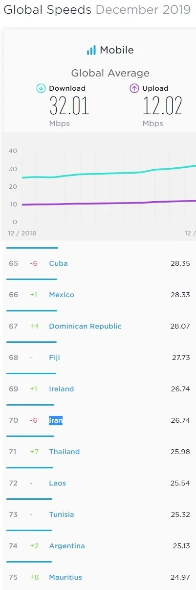 گزارش اخیر شاخص جهانی SpeedTest که از سوی موسسه Ookla ارایه میشود، حاکی از افت 6 پلهای ایران در فهرست اینترنت پرسرعت است. در حالی که بر اساس این شاخص، متوسط سرعت دانلود اینترنت سیار در جهان، حدود 32.01 مگابیت در ثانیه است، ایران با رقم 26.74 مگابیت در ثانیه، در جایگاه هفتادم جهان ایستاده است.