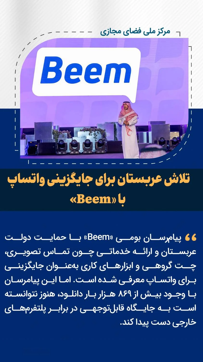 «Beem»، یک پیامرسان بومی عربستان سعودی است که در فوریه ۲۰۲۳ طی رویداد فناوری «LEAP» در ریاض توسط شرکت سعودی «MENA Communication Holding Company Limited» و با همکاری بزرگترین اپراتور مخابراتی عربستان، Saudi Telecom Company (STC)، رونمایی شد. این اپلیکیشن با ارائه امکاناتی چون تماس صوتی و تصویری باکیفیت، چت گروهی، فیلترهای واقعیت افزوده و ابزارهای همکاری حرفهای، بهعنوان یک پلتفرم چندمنظوره طراحی شد تا نیازهای شخصی کاربران و کسبوکارها را برطرف کند. تاکنون، این برنامه با بیش از ۸۶۹ هزار دانلود و امتیاز ۳.۸ از ۵ در فروشگاههای اپلیکیشن، استقبال نسبی را تجربه کرده است. کاربران از کیفیت تماسها و سادگی آن رضایت دارند، اما چالشهایی مثل کندی رابط کاربری یا محدودیتهای ذخیرهسازی رسانهها نیز مطرح شده است.