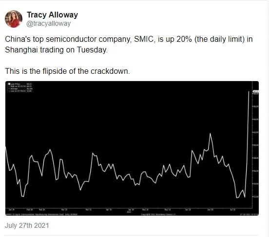 ۴- در ضمن، همانطورکه بر اساس نظریه من قابل پیشبینی بود، سهام پرچمدار نیمهرسانای چین، SMIC، در حال سقوط است: