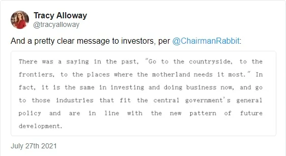 «پس از آنکه تفسیر افراطی یک حامی مائوئیست معروف در رسانههای دولتی با استقبال رسمی روبرو شد، شکافی ایدئولوژیک بین رئیسجمهور چین شی جینپینگ[۴] و نخبگان تجارت و فرهنگ کشور ایجاد شده است.