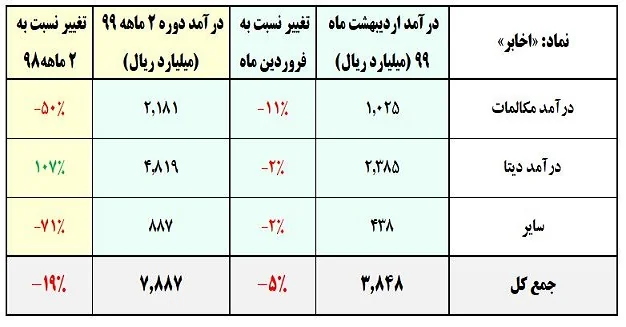 در مجموع، مبلغ درآمدهای «اخابر» در اردیبهشت ماه نسبت به فروردین ماه کاهش 5 درصدی و در مجموع 2 ماه ابتدای سال جاری نسبت به 2 ماه اول سال قبل کاهش 19 درصدی را نشان می دهد.