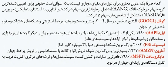 در 3 ربع نخست سال 2020، 5 غول دیجیتال با ویروس منحوس «کووید-19» برای تصرف زندگی بشر همدست بودهاند: گوگل، اپل، فیسبوک، آمازون و مایکروسافت. این پادشاهی به اختصار (برگرفته از نام آنها) «گافام» خوانده میشود. آنها بزرگترین کاسبان بحرانی تاریخی هستند که اغلب کسبوکارهای چهارگوشه عالم را به تعطیلی کشاند. نهتنها در این دوره هراس و انزوای انسانها ناشی از فاصلهگذاری اجتماعی بویژه در جوامع پیشرفته، درآمد گافام به عنوان غولترین شرکتها در میان دهها پیشرو دنیای دیجیتال سر به فلک گذاشته، بلکه ارزش سهام آنها نیز به لطف تغییر رویکرد بیسابقه بازار سهام چند برابر شده است.
