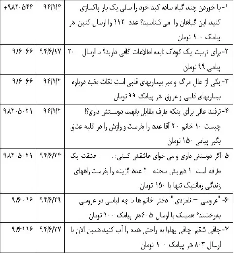 در این یادداشت چند نمونه از پیامکهای انبوه ارسالی به مشترکان ذکر شده است. مرور آنها (صرفا نمونه است) نشان می دهد که اپراتورهای پیامکی همه فن حریفند!! پزشکی، روان پزشکی، فرهنگی، تربیتی، مذهبی، مشاوره ای و … و معلوم نیست پاسخ دهنده کیست؟ چه تخصصی و در چه حدی دارد؟ چه تجارب و برای چه مدتی دارد؟ نام و نشانش چیست؟ مجوز کسب و کارش را از چه سازمانی گرفته است؟ لذا تخلف محرز است و قاعدتا باید وزارت ارتباطات این رویه را اصلاح کند. ولی متأسفانه این اتفاق نیافتاده است.»