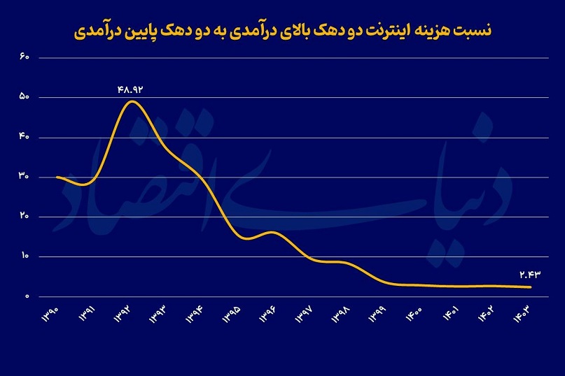 به عبارتی اینترنت توانسته است به یک جایگزین فرهنگی و تفریحی برای کالاها و خدمات سنتیتر تبدیل شود. همچنین هزینه اینترنت دو دهک بالای کشور نسبت به هزینه دو دهک پایین، مستمرا کاهش یافته و از ۴۸برابر در سال۱۳۹۲ به ۲.۴برابر در سال۱۴۰۳ رسیده است. مشابه همین روند، هزینه اینترنت خانوار شهری نسبت به خانوار روستایی از ۱۰.۸برابر در سال۱۳۹۲ به ۱.۶برابر در سال۱۴۰۳ رسیده است. بنابراین از یک طرف اینترنت تبدیل به کالای غالب فرهنگی و تفریحی شده و از طرف دیگر شکاف استفاده از آن میان طبقات درآمدی و میان شهر و روستا بهشدت کاهش یافته است. در نتیجه این فرآیند، اختلاف فرهنگی شهر و روستا، و فقیر و غنی کاهش یافته است و علاوه بر ایجاد وابستگی سراسری به اینترنت، یک نوع همگرایی ذهنی نیز در سراسر کشور ایجاد کرده است.