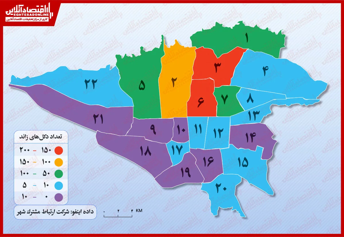 به گزارش اقتصادآنلاین، دکلهای مخابراتی در تمام نقاط تهران دیده میشوند اما در برخی نقاط تراکم آنها بیشتر است. مطابق با اینفوگرافی زیر که دادههای آن را شرکت ارتباط مشترک شهر منتشر کرده؛ منطقه 3 و 6 بیشترین مازاد دکل را دارند.