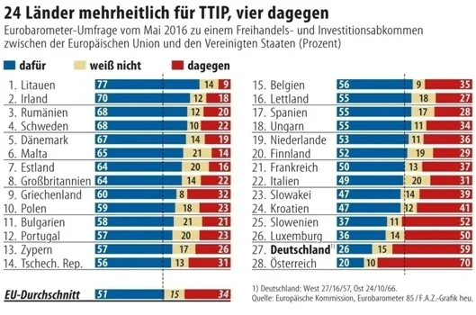 با اندازه گیری تعداد موافقان و مخالفان اروپایی در می 2016 معلوم شد مردم 24 کشور عضو اتحادیه اروپای واحد با عقد پیمان TTIP موافقند و مردم تنها 4 کشور عضو، مخالف آن هستند. این چهار کشور عبارتند از: اسلوونی، لوکسامبورگ، آلمان و اتریش